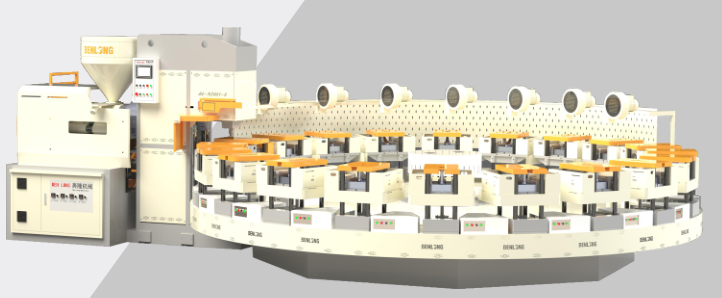 圓盤式內注連幫注射成型機:雙人協(xié)作(1人取楦,1人套幫)就可做鞋,全自動開合模,高效又省力!